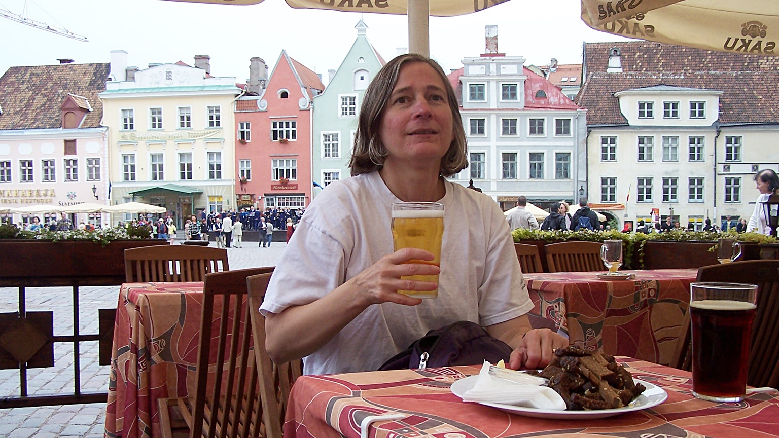 Garlic bread and Estonian beer in the town square. Behind Debbie on the left, a military band was playing.
