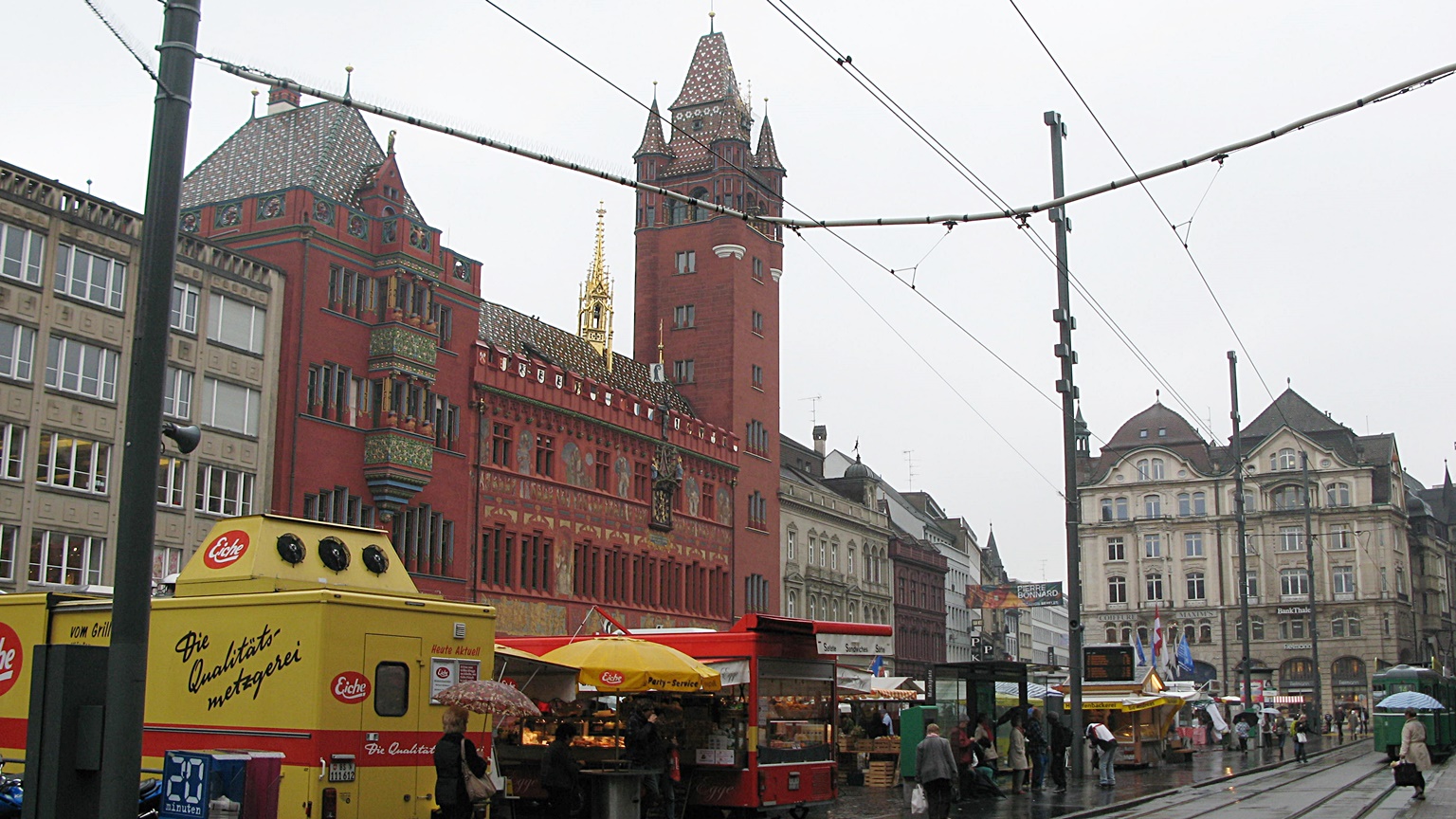 A rainy day at the market in front of the Basel Rathaus (city hall).